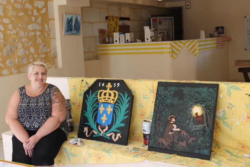 The two plaques have been cleaned and made ready for painting. Natalaie a volunteer from the UK has been painting the plaques so as to make ready for their resting place at La Giraudiere.